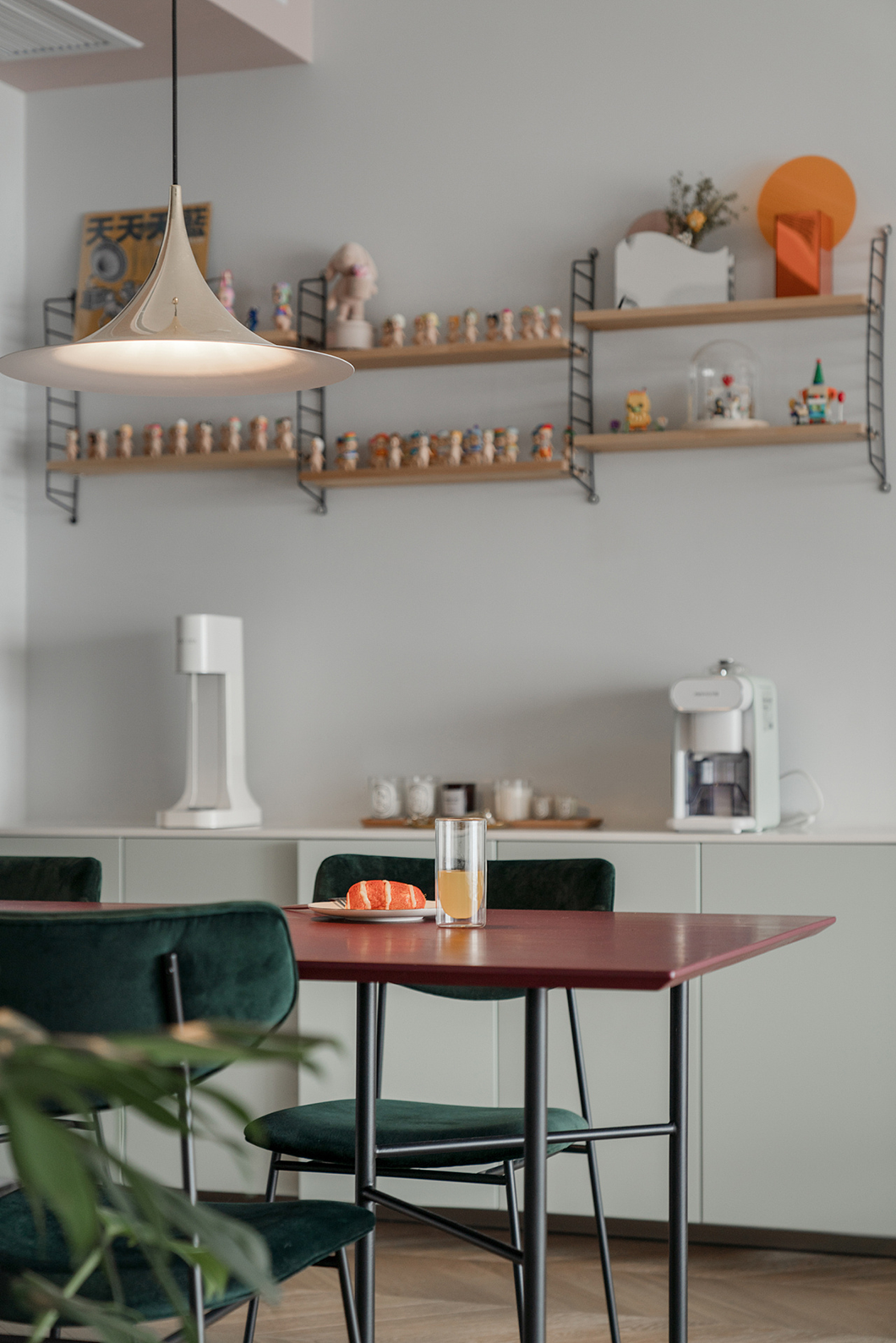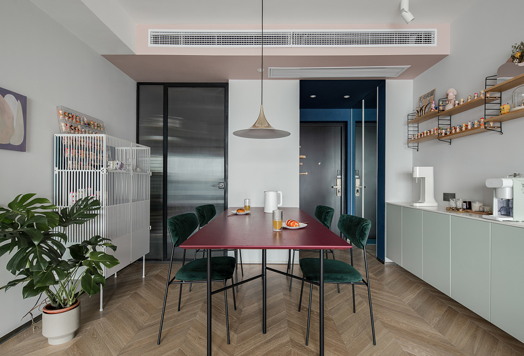 混搭技巧,如利用造型不同、顏色相同的餐椅組合,餐區的餐椅造型多變且風格迥異,但因為它們都是黑色,在視覺上形成了統一感,所以并不會產生違和感
