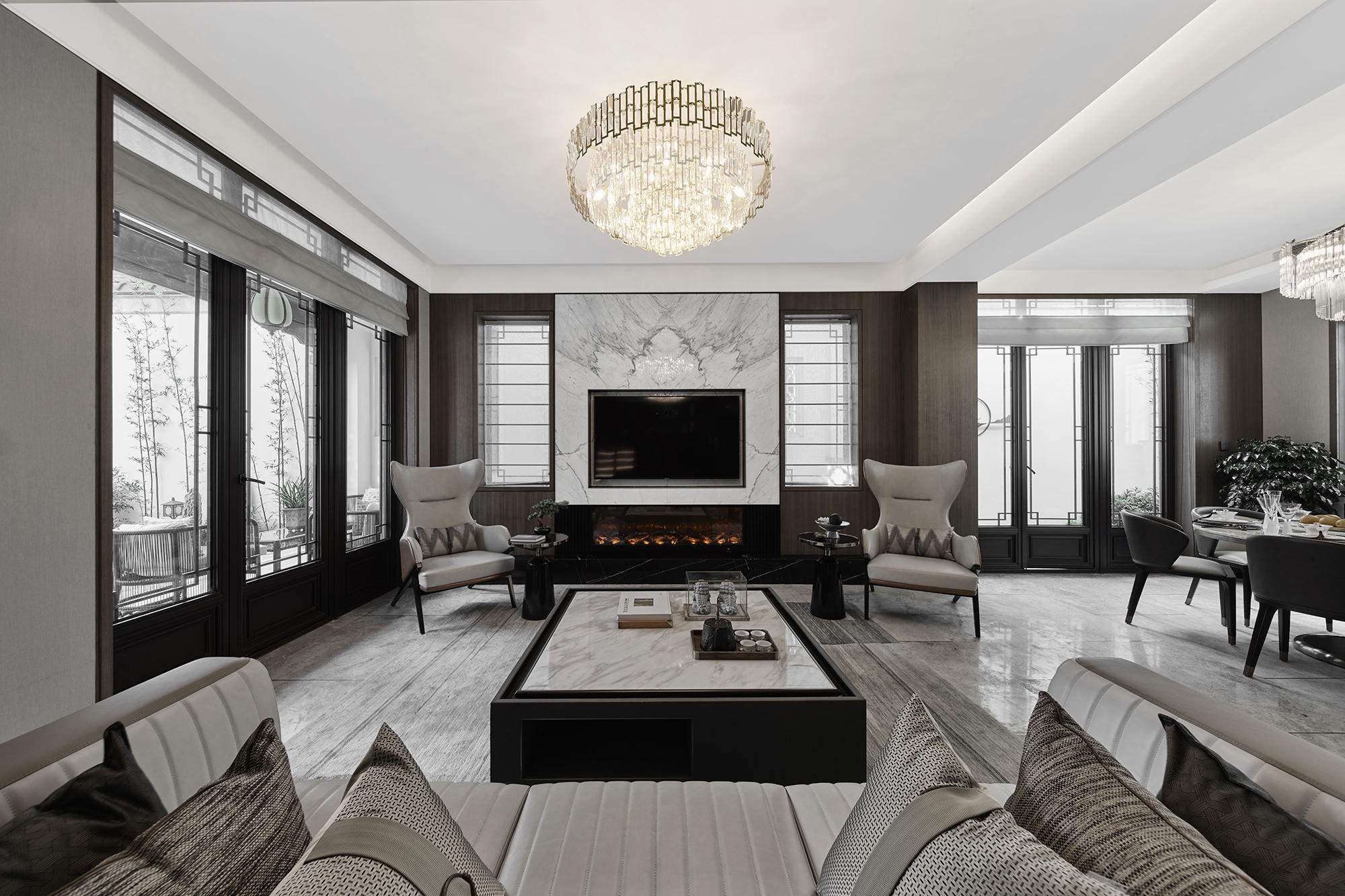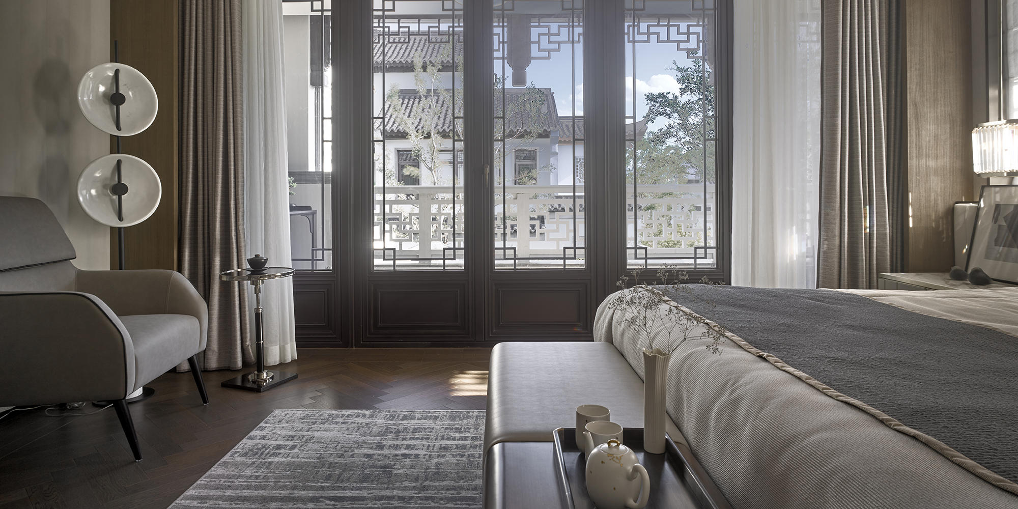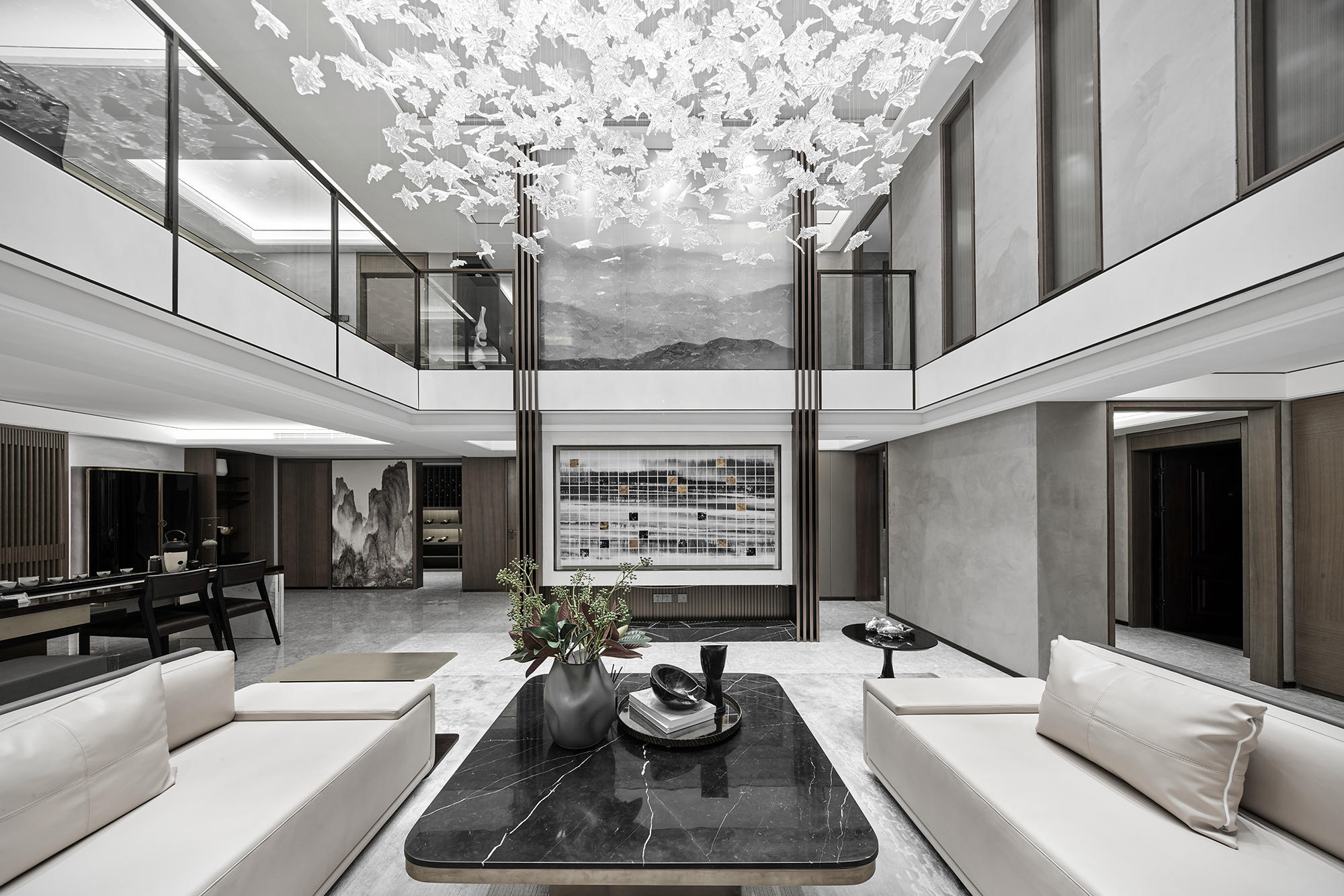眺望富春江,背倚黃公望國(guó)家森林公園,綠城·富春玫瑰園以賦予有無(wú)相生、道法自然的東方哲思,匠心創(chuàng)作出遵循中式美學(xué)內(nèi)涵的庭院居所,隱逸生活映現(xiàn)于世。