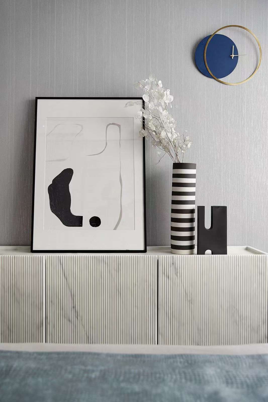 客廳空間褪去浮華的裝飾,以素白與雅灰為主,小面積的咖色與藍(lán)色帶起節(jié)奏感。從陶藝文化中萃取而來的元素,化為各種性格鮮明的線條、形狀和肌理,充斥在空間的細(xì)節(jié)處。藝術(shù)與生活的邊界在此彌散,營造出靜謐而有格調(diào)的閑適光景!